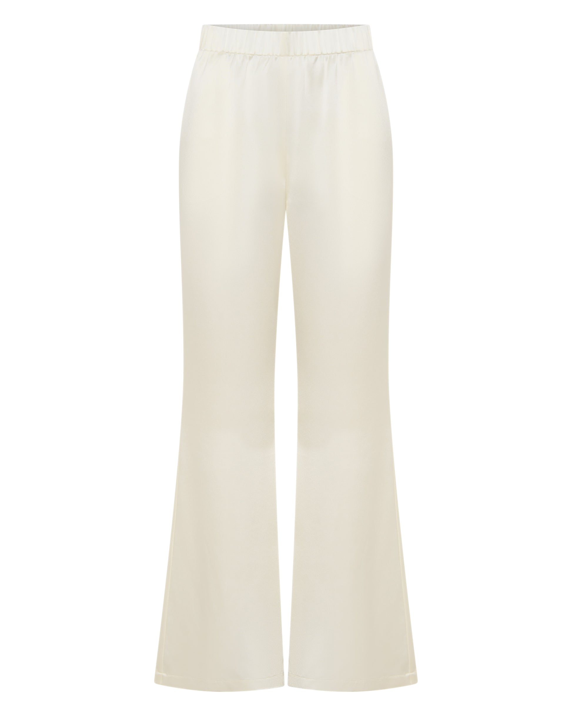 The Alora pant showcases a luxurious golden draped fabric paired with a thick elastic waistband for a comfortable, flattering fit in warm climates.
