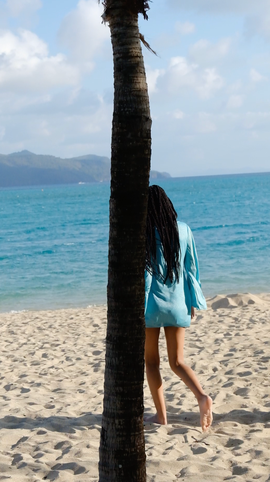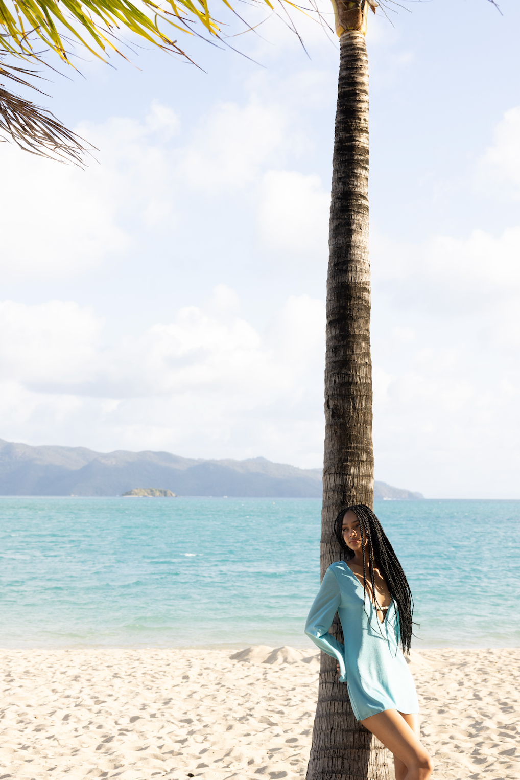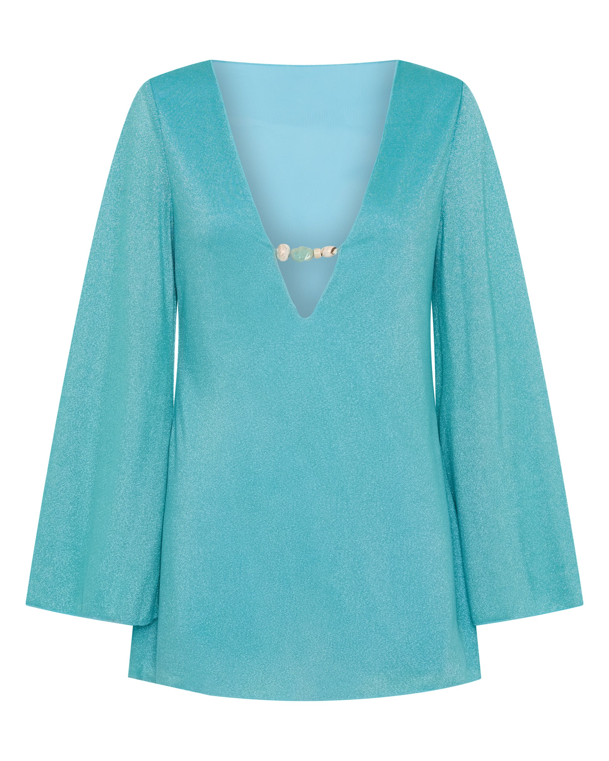 The Nautila Dress exudes island elegance with its luminous aqua tone and delicate shell-inspired detailing along the neckline.